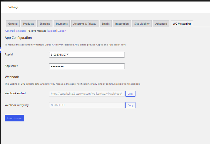 webhook end URL and webhook verify key is automatically generated in setting page. Finally, save changes.