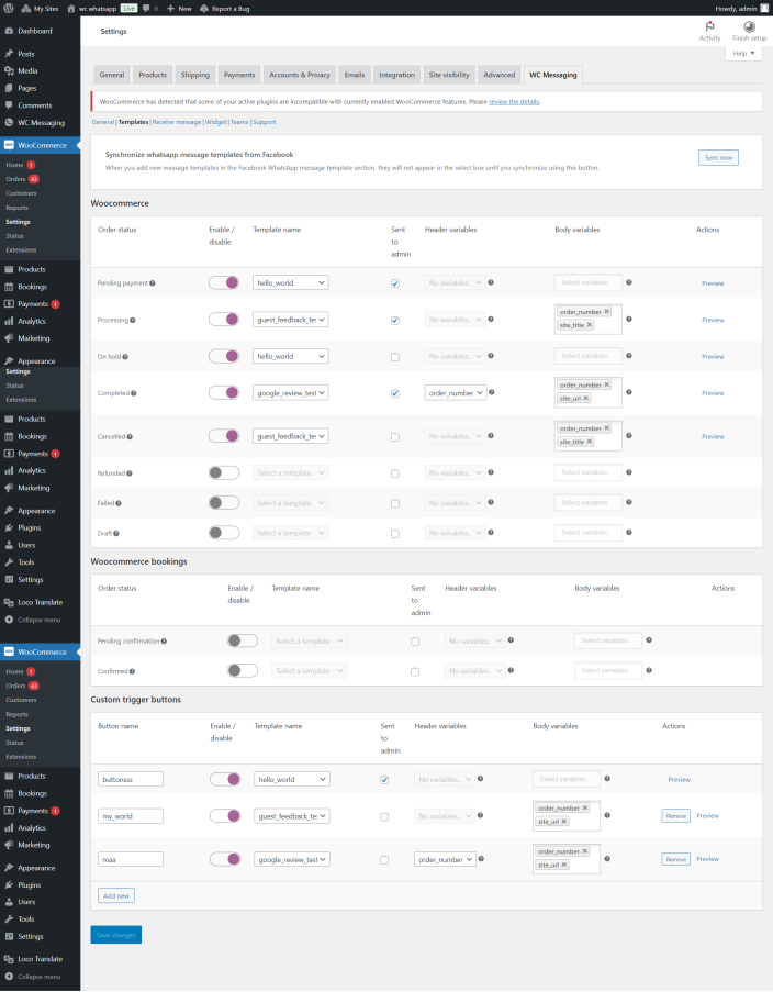 Custom trigger buttons : custom trigger buttons on the WooCommerce order details page, enabling admins to send custom pre-defined message templates to customers with just a click.