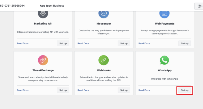 7. The app will then be created and you’ll be asked to select the products you want to add to the app. Scroll down and click the Set up button under WhatsApp.