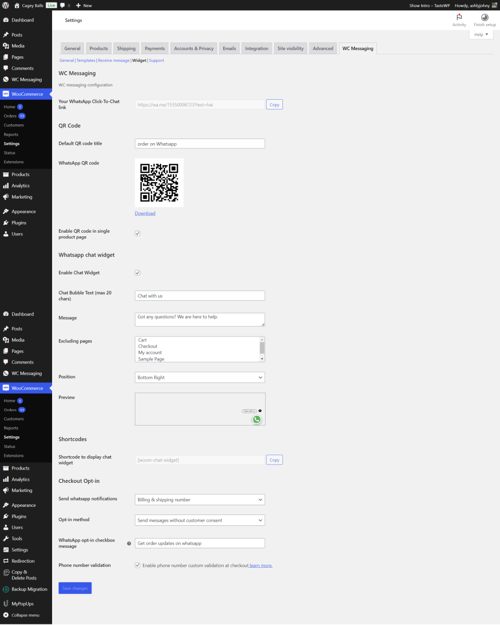 ↑ Back to topTo configure custom widget options like Click to Chat or WhatsApp QR Code, navigate to WC Messaging -> Settings -> Widgets. If you want WhatsApp chat icon then enable the chat icon and adjust its label, message, and position according to your preferences. Once done, use the short code [woom-chat-widget] to display the WhatsApp chat icon anywhere on your site. Don’t forget to save your changes to apply them effectively.