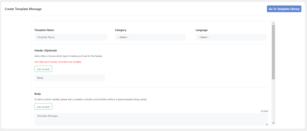 - Ensure that when using multiple variables in your WhatsApp template message body, your content sufficiently fills the space without being too sparse. Facebook may reject templates with excessive variables and minimal content. Strike a balance to avoid rejection. Make sure your WhatsApp template message body doesn’t surpass the 1024-character limit, especially when using variables for personalization. Keep it brief and focused to stay within the boundaries.