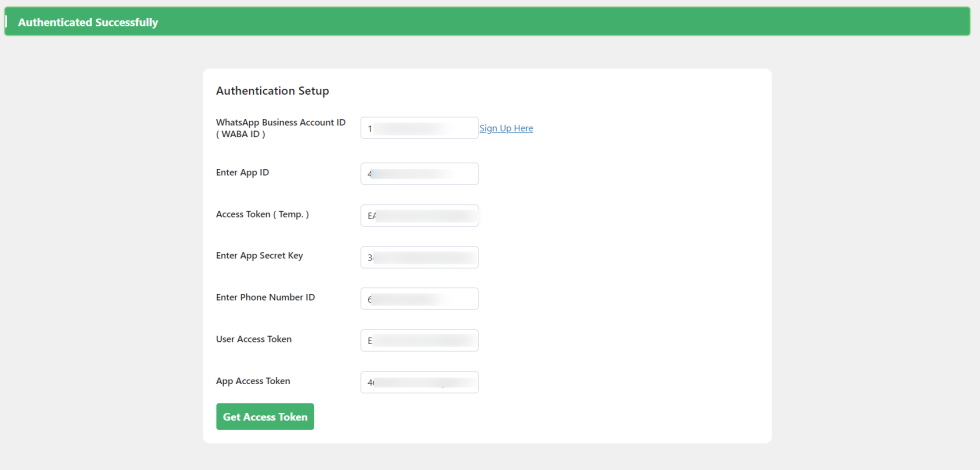 These details, comprising WhatsApp Business Account ID, Phone Number ID, App ID, App Secret Key, and Temporary Access Token, are vital for establishing a successful connection with the WhatsApp Business API plugin. You would typically need to input the collected details into the relevant fields in the plugin configuration. Before Authentication, the Authentication setting looks like this.