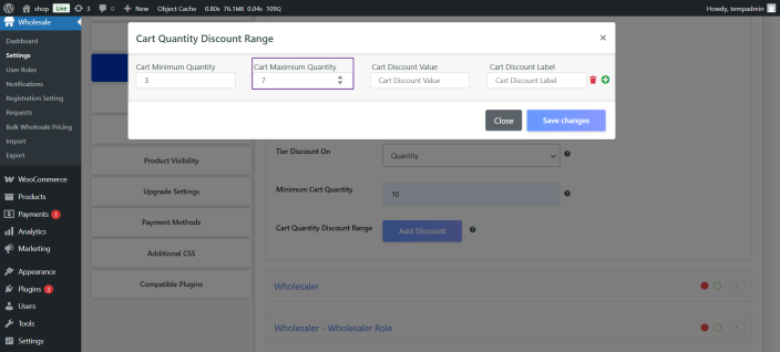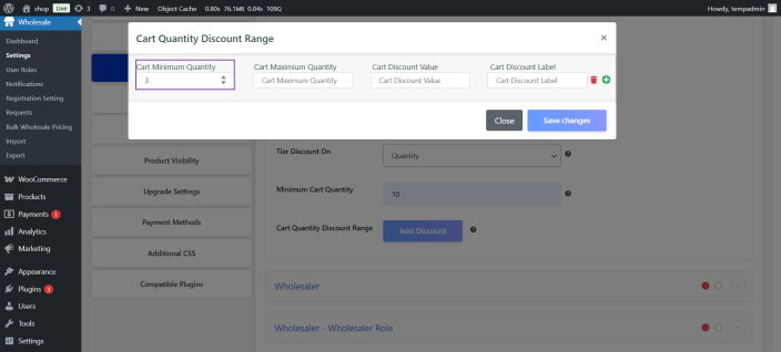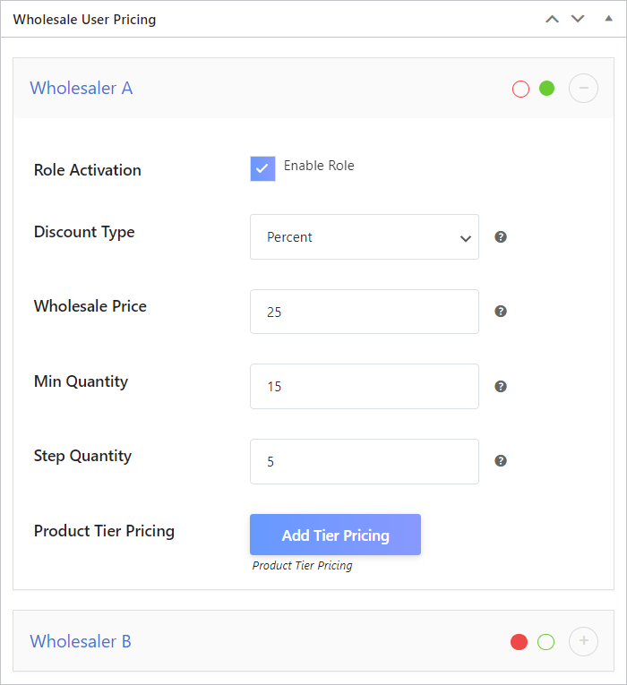 Create different levels of wholesale allows users to level up to get better pricing options and benefits. This option also helps define different minimum quantity requirements for each role.