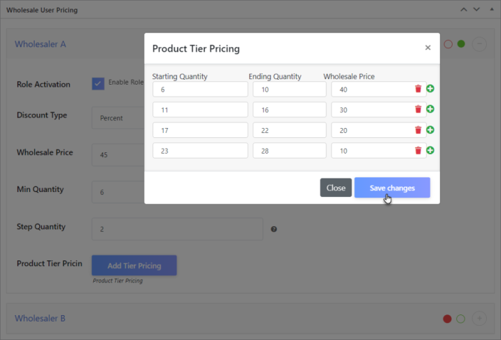 You can create pricing strategies based on different price levels and wholesale user roles, for instance, 20% discount for User A and 30% discount for User B on the same product.