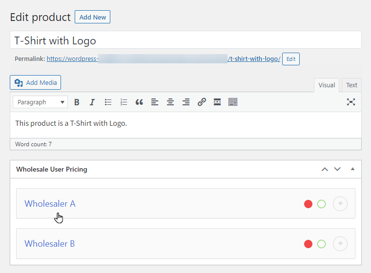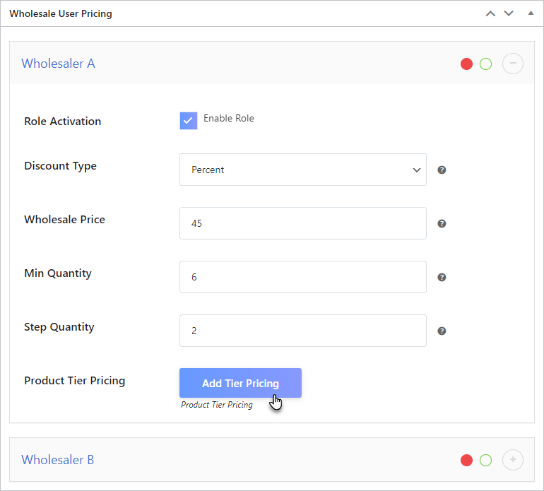 It is a tiered level pricing system that allows you to offer different types of discounts and prices to different wholesale user roles. You can enable and set wholesale prices from the Wholesale Multi-User pricing meta box.