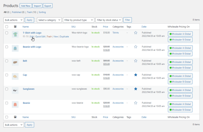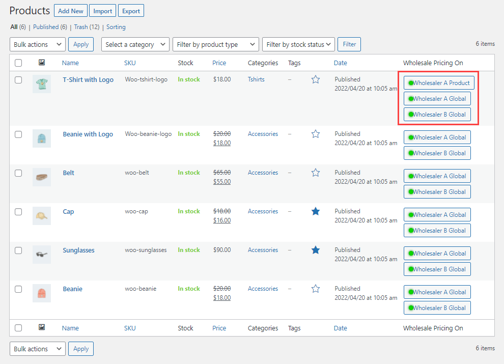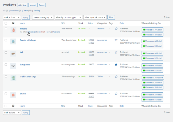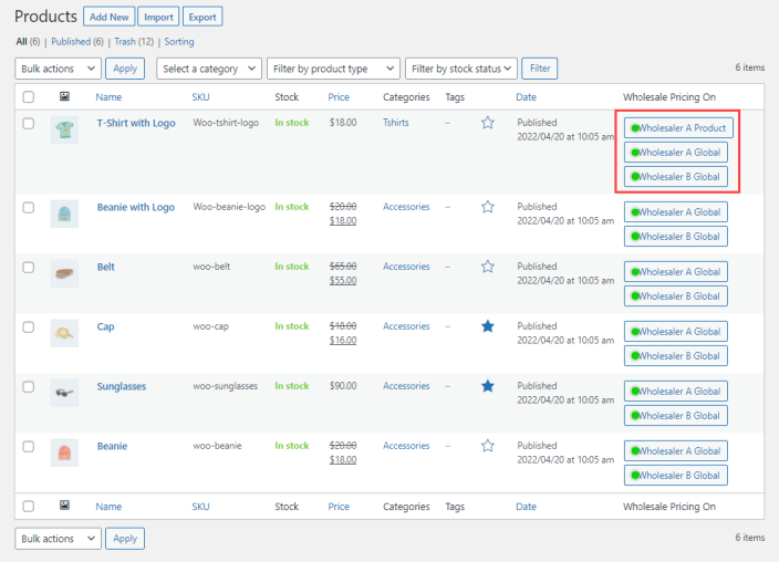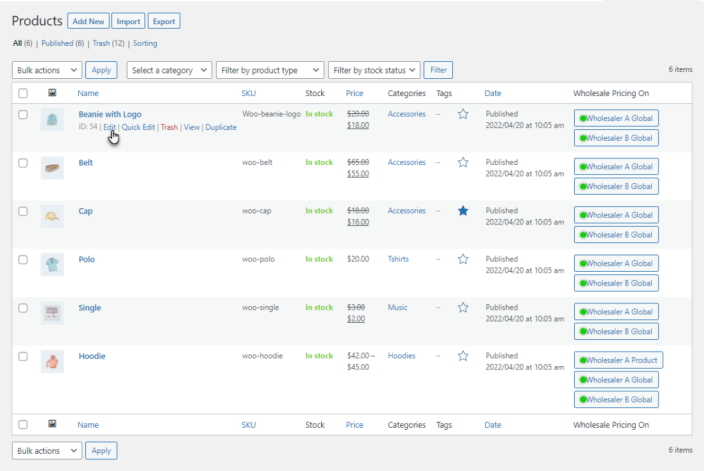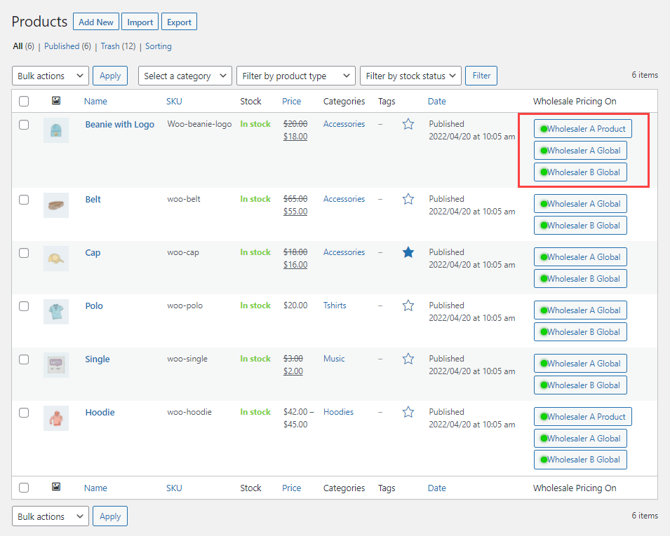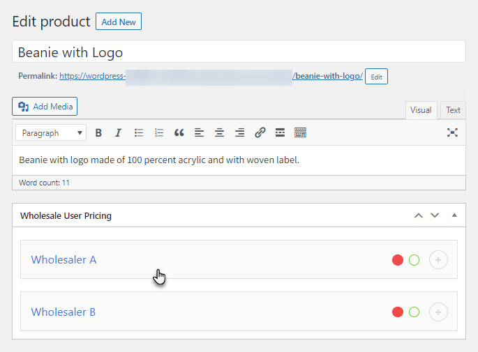 ↑ Back to topSet wholesale prices for individual products on single and multiple wholesale role levels. You can also set wholesale prices on simple and variable products.