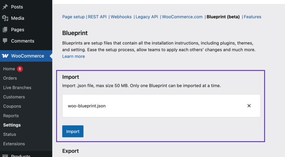 ↑ Back to topImporting a Blueprint file allows you to apply a previously saved store configuration to a new or existing WooCommerce site.