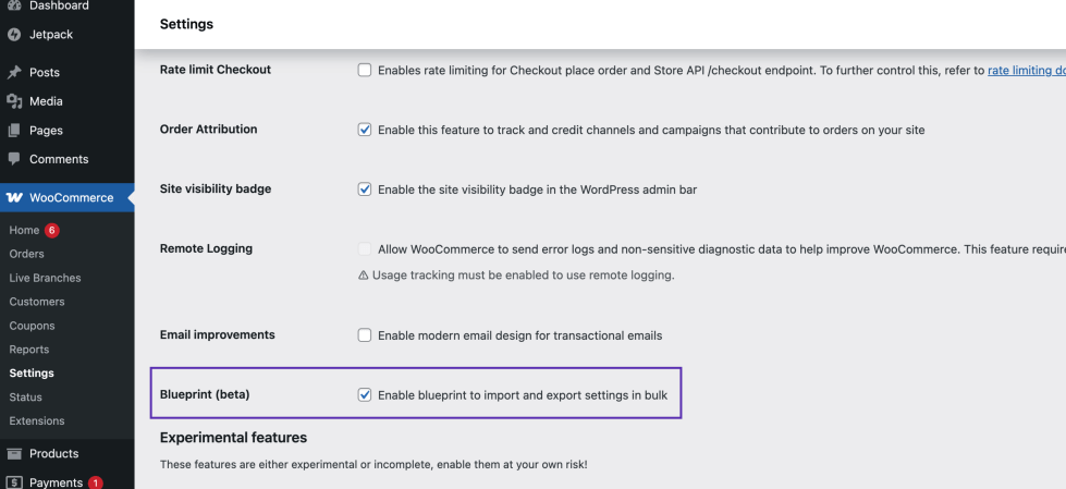 Once enabled, a new Blueprints option will appear under WooCommerce > Settings > Advanced > Blueprints