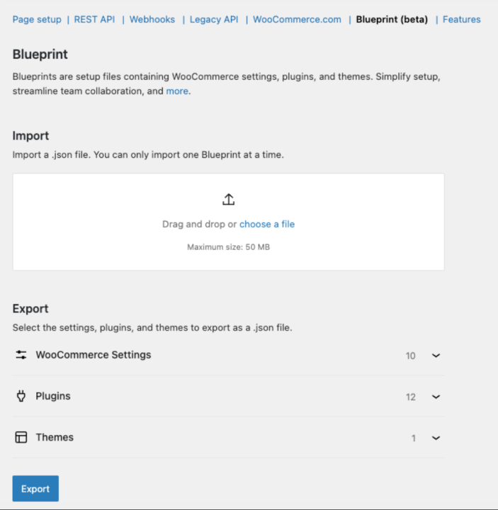 ↑ Back to topExporting a blueprint allows you to save your current store configuration into a .json file that can be reused and imported into another WooCommerce site. To export your WooCommerce store Blueprint, follow the steps below: