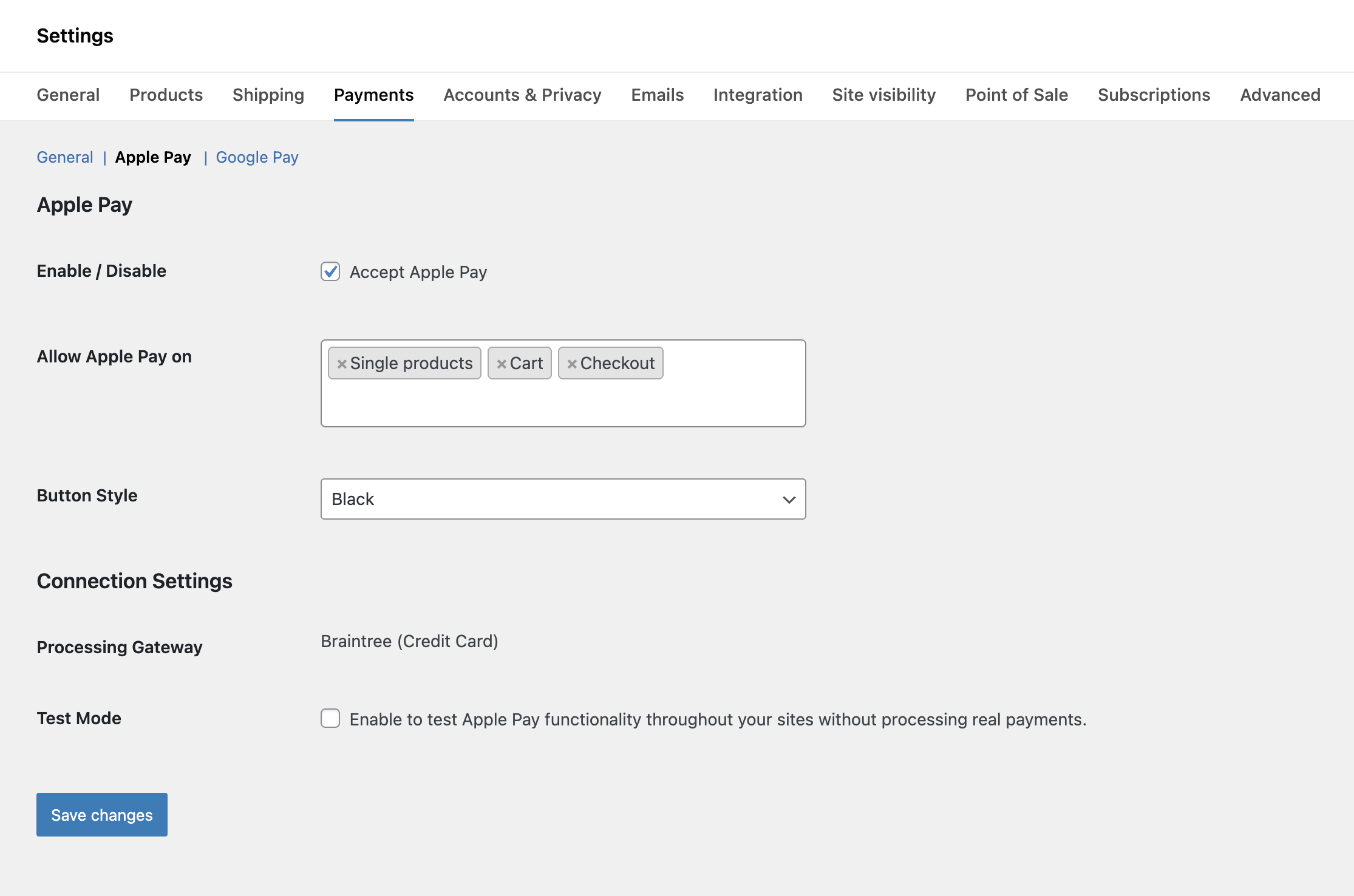 - For each payment method you want to support, go to WooCommerce > Settings > Payments and select the Braintree payment method you want to enable.