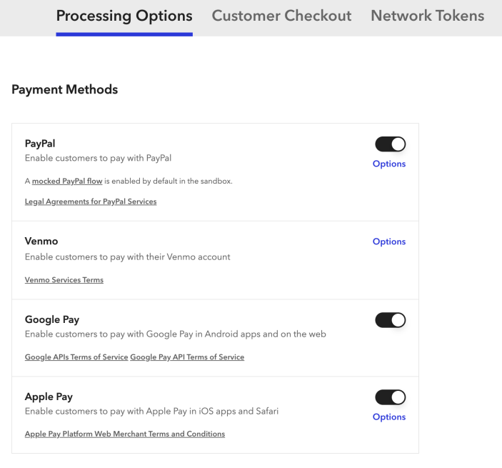 To use PayPal, you’ll first need to enable PayPal in your Braintree account – log in to your account, go to Settings > Processing, and enable the PayPal payment method.