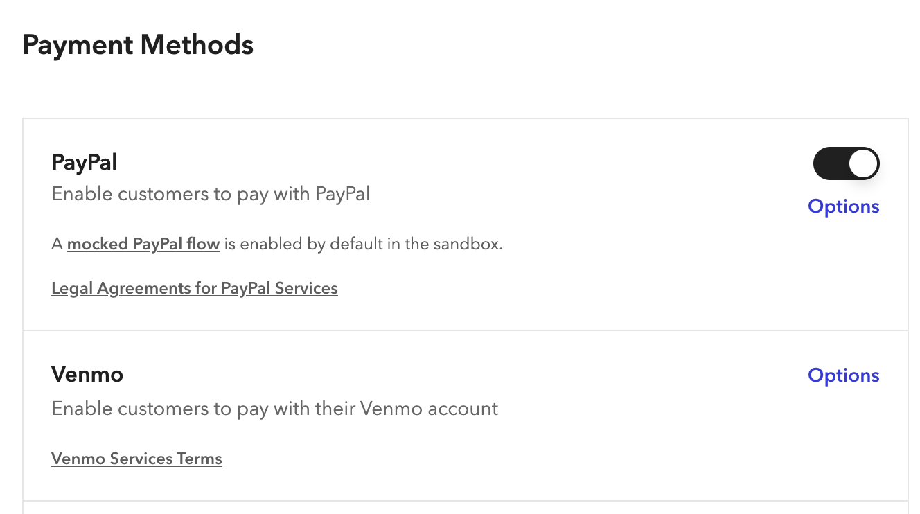 ↑ Back to topTo use the Braintree Venmo gateway, you must have a US business entity, meet additional eligibility requirements, and enable Venmo in your Braintree account under Settings > Processing. Note that Venmo is only available for US purchases in USD.