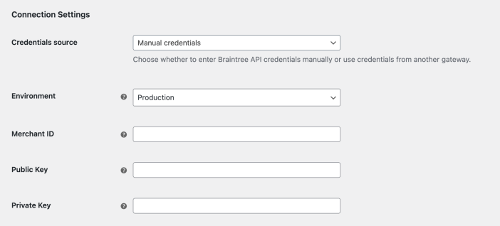 - Credentials source: Either use credentials specific to the credit card gateway by selecting “Manual credentials”, or use the credentials from the PayPal gateway by selecting “Use credentials from Braintree (PayPal)”, which will only be available when credentials have been entered for the PayPal gateway.