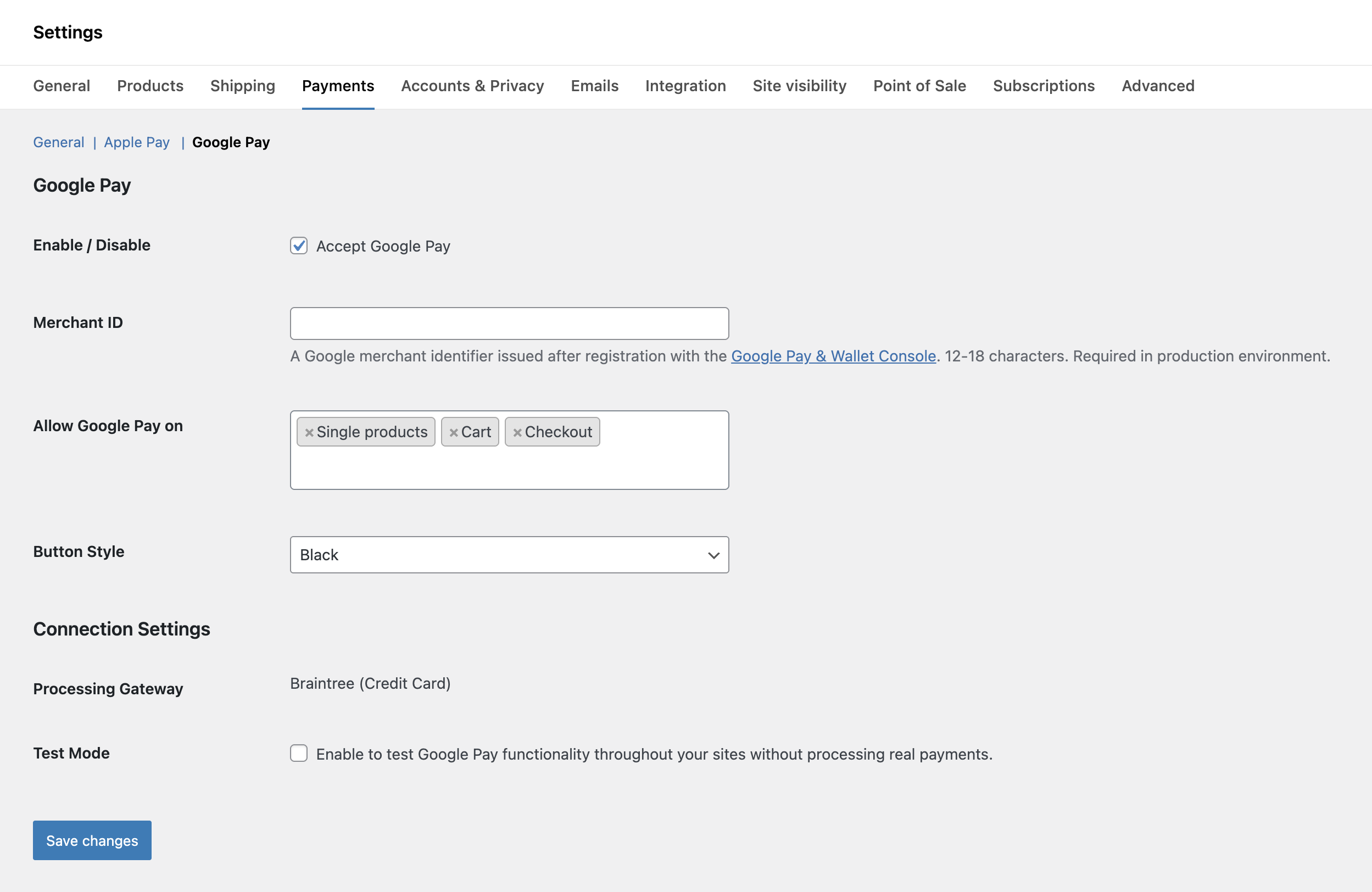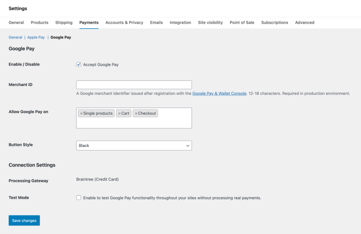 - Go to WooCommerce > Settings > Payments and select the Braintree gateway you want to update.
