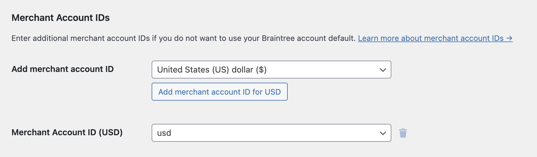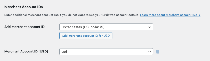 - Merchant Account IDs: Use if you have different merchant accounts for multi-currency support, or if you need to use a specific merchant account that has payment features enabled. Click here to read more about Braintree multi-currency.