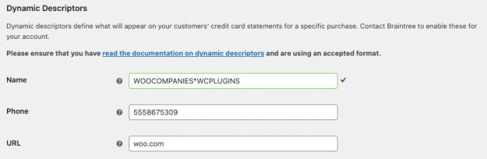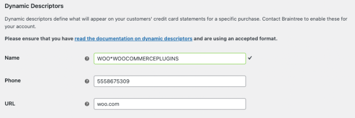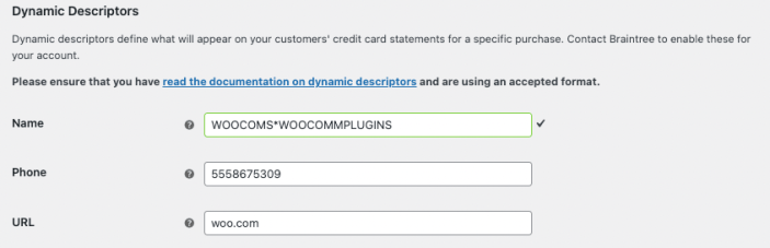 Once enabled by Braintree, you can configure Dynamic Descriptors in the gateway settings. There are three format options for the Name field – please note that components must be separated by an asterisk: