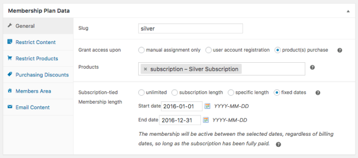 - Set length or fixed date memberships – The membership status will listen to subscription status until the subscription ends (signifying payments are done), after which the membership will observe its own end date settings.