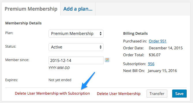 ↑ Back to topUser membership management will be very similar for memberships purchased via subscription in comparison to those purchased via other product types. However, a membership tied to a subscription will have a couple of additional actions an admin can take.