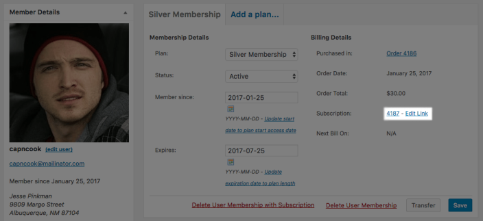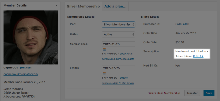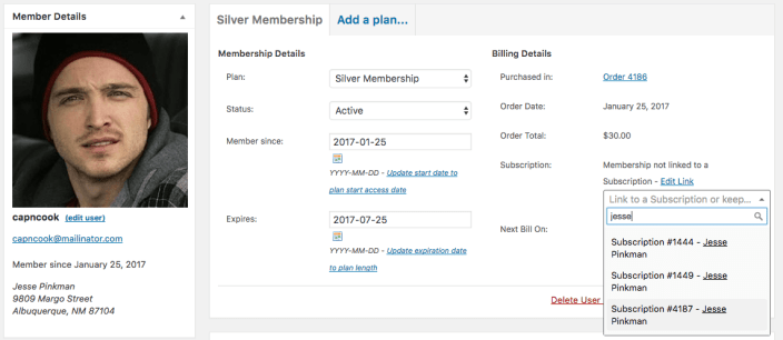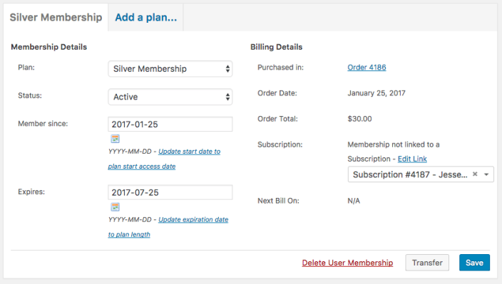 For example, if you want to manually upgrade a member’s subscription to “Gold”, and they should have access to a different membership plan as a result, you should change the user membership’s plan, too. The status of the membership will remain tied to the subscription.