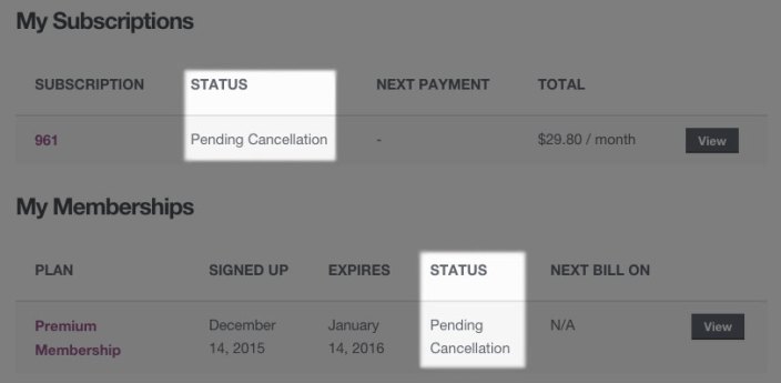 When the subscription switch is complete, the old subscription is replaced with the new one and remains active. While this process occurs, Memberships will cancel the old membership and create a new one based on the subscription selected.