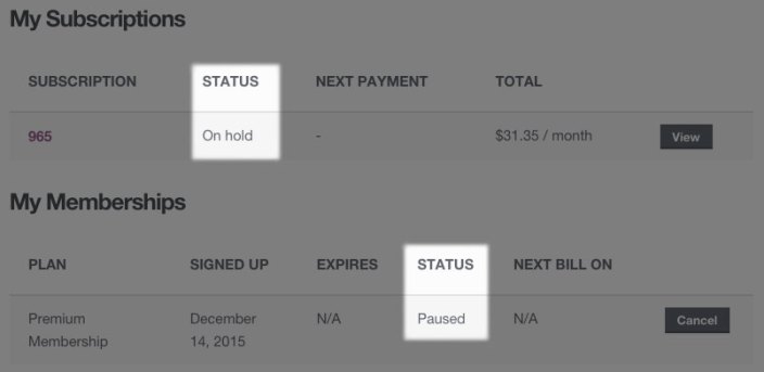 When this action is processed, the subscription status is changed to “on hold” until the subscription is re-activated. Since the subscription is suspended, the membership status will also change to “paused” automatically. Customers cannot access restricted content while a membership is paused.