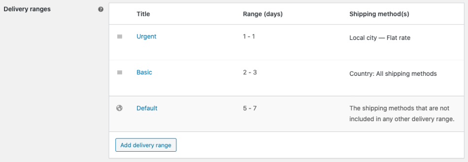 Note: The title parameter is only visible to you; your customers will not view the title during checkout. That means you can group all shipping methods with the same range of days under a unique delivery range. There is no need to split the shipping methods into multiple delivery ranges, although it’s a completely valid setup.