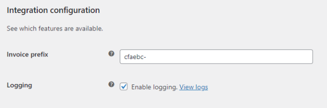 The integration configuration includes the configuration for the invoice prefix and logging.