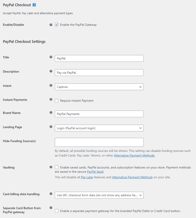Configure your desired PayPal button appearance and click Save changes to enable PayPal. By default, the PayPal gateway and smart buttons are enabled on the Checkout, single product, and Cart pages.