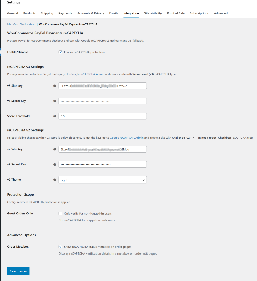 - In your WordPress dashboard, go to WooCommerce → Settings → Integration → WooCommerce PayPal Payments reCAPTCHA.