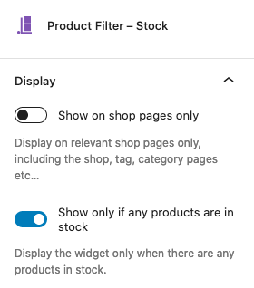 - Show only if any products are in stock – This option is enabled by default and will cause the filter to be displayed only if there are any products in stock or available on backorder.