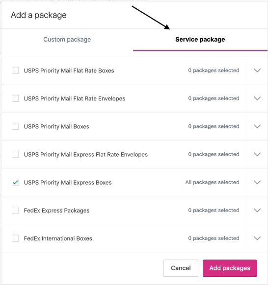 ↑ Back to topMany carriers offer free shipping supplies to be used when shipping with them. For your convenience, many of those packages are already prepopulated in the WooCommerce Shipping settings.