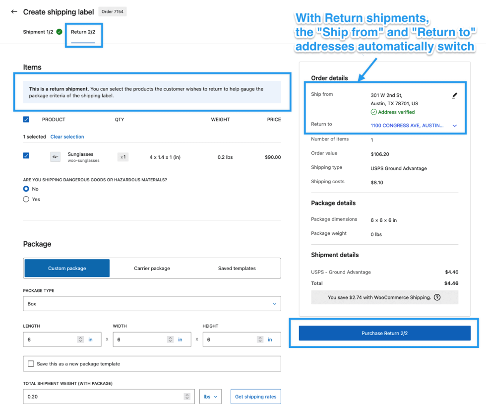 If you would like to have returns sent to an address that is different from your Origin address, you can add a new address on the WooCommerce > Settings > Shipping > WooCommerce Shipping page and solely check the “Save as default return address” box at the bottom and leave the “Save as default origin address” box un-checked.