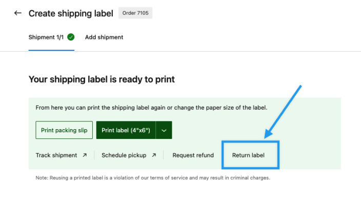 Once you have purchased the regular label you will be using to ship the package to your customer, you will see the “Return label” link in the print box in label UI, next to the “Request refund” link: