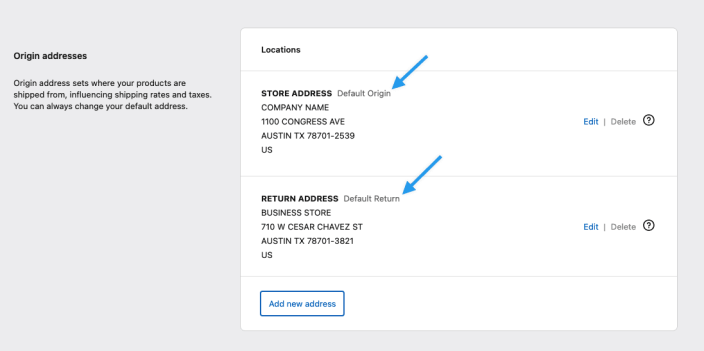 You can confirm which address is currently set as the Default Origin and Default Return by looking at what is shown next to the Name for each address: