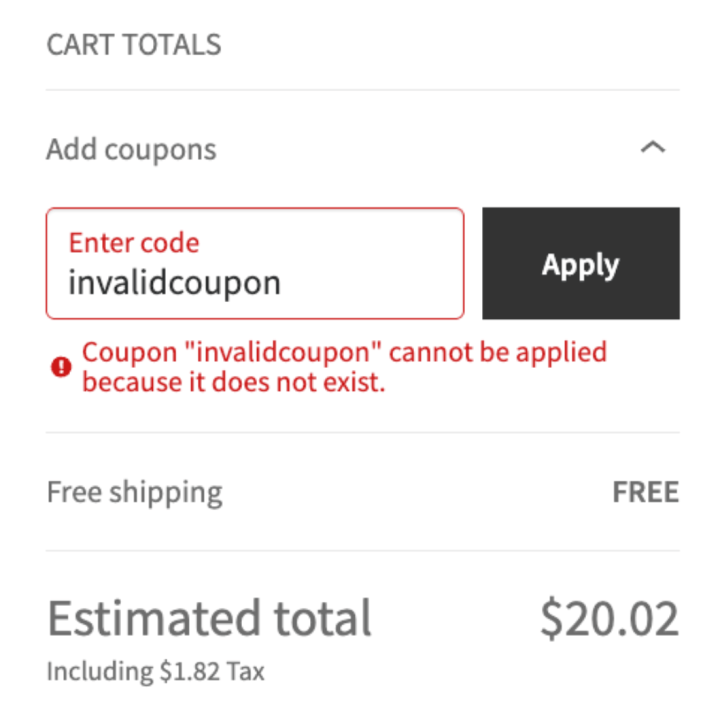 - Invalid or expired codes: If the code is invalid (e.g., misspelled or expired), the customer sees an error message and the code is not applied.