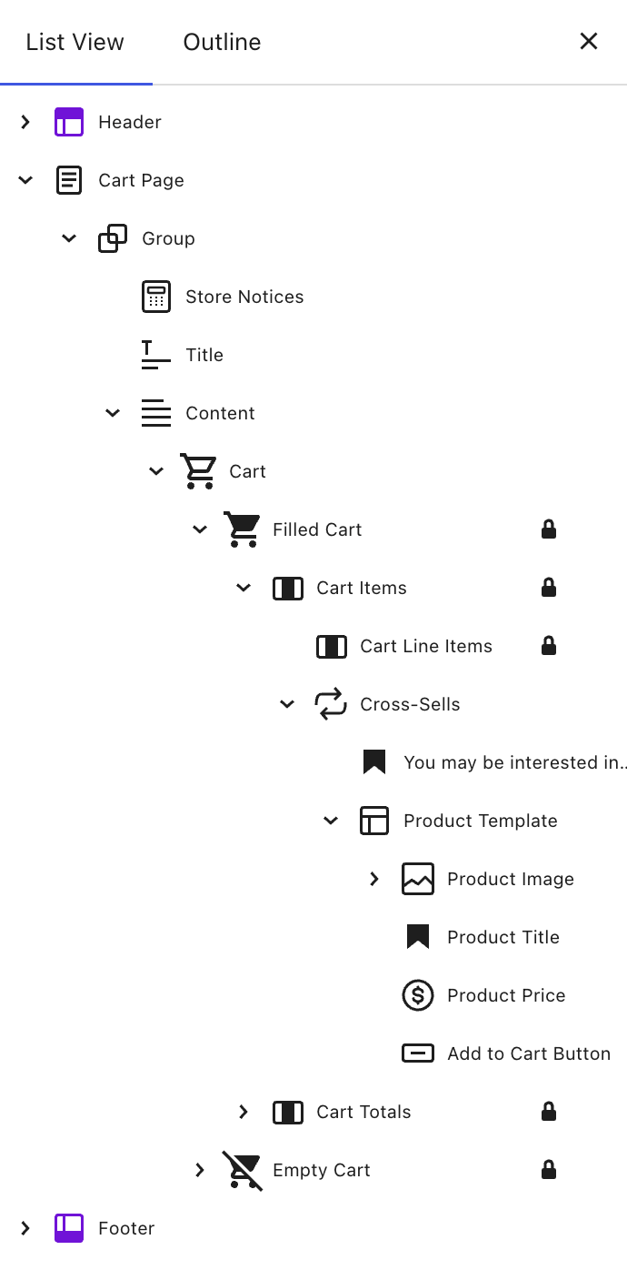 If you open the List View, you’ll see that the cart template contains a block named Cart. This Cart block has these two states nested inside of it. Each state contains distinct elements and customization options.