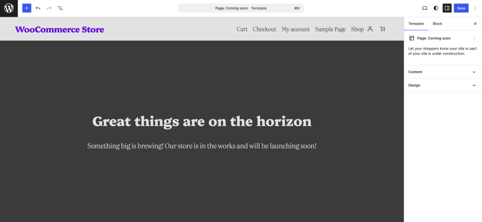 The Coming Soon WooCommerce page template includes a selection of pre-built design patterns that you can use as a starting point.