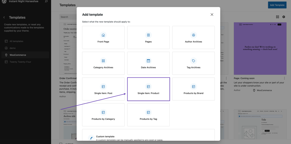 - A modal window will appear where you can select the product for which you want to create a unique template.