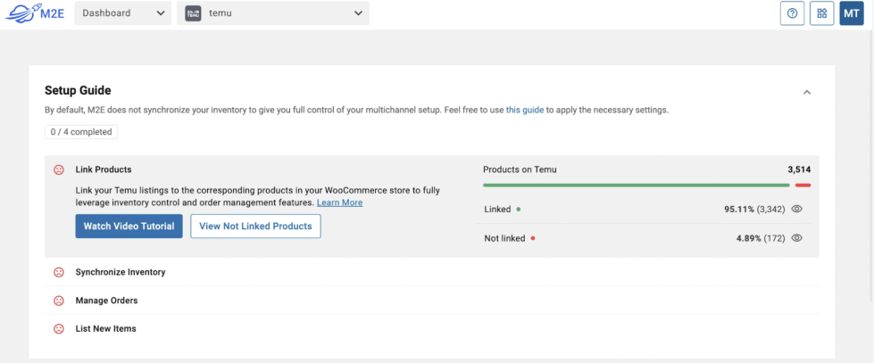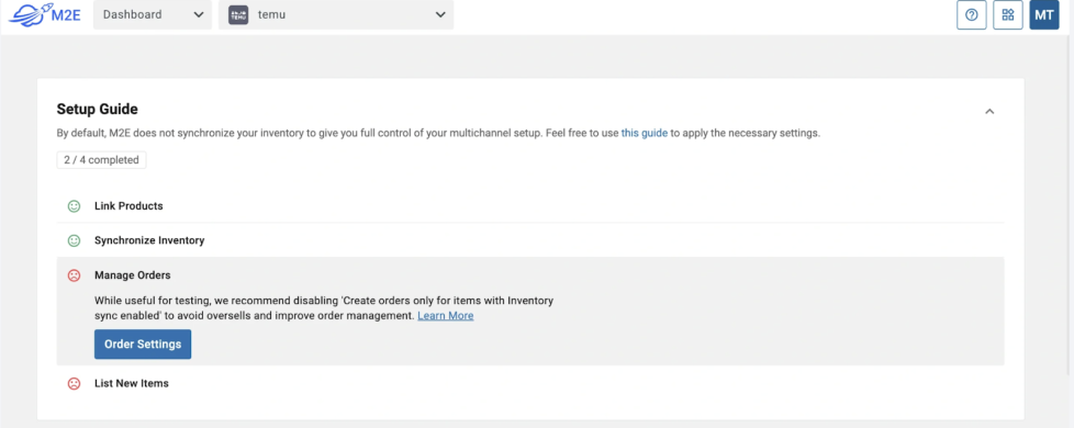 - Centralized work. You manage listings, inventory, and orders in WooCommerce while M2E runs the sync with Temu.