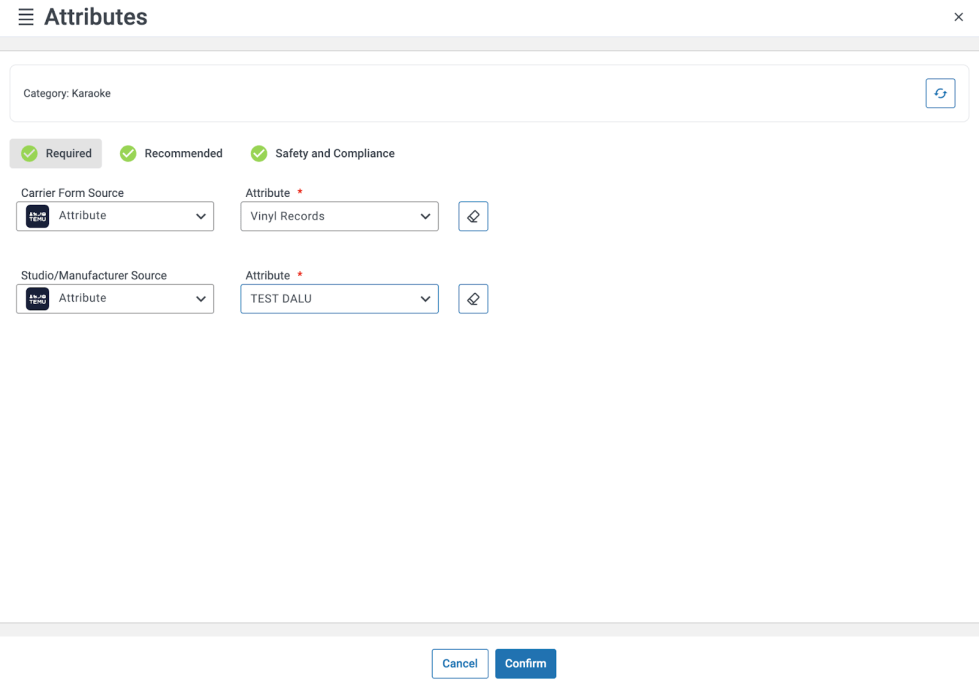 You can map attributes such as Brand, Manufacturer, GPSR data, variation options, or correct values that do not match Temu rules.