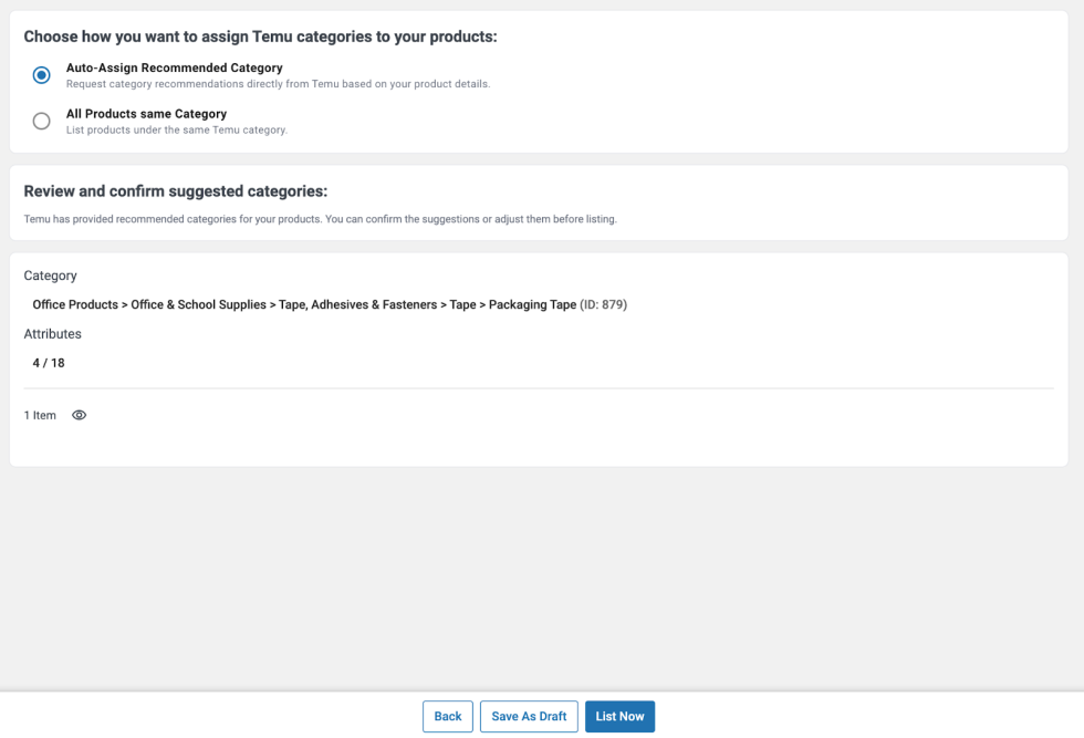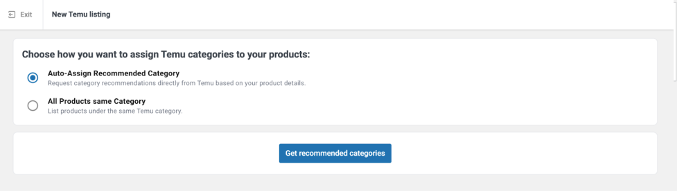 - Choose Auto-Assign Recommended Category and ask Temu to suggest a category based on your product details (click Get recommended categories, then confirm or edit it)