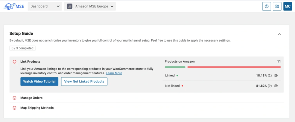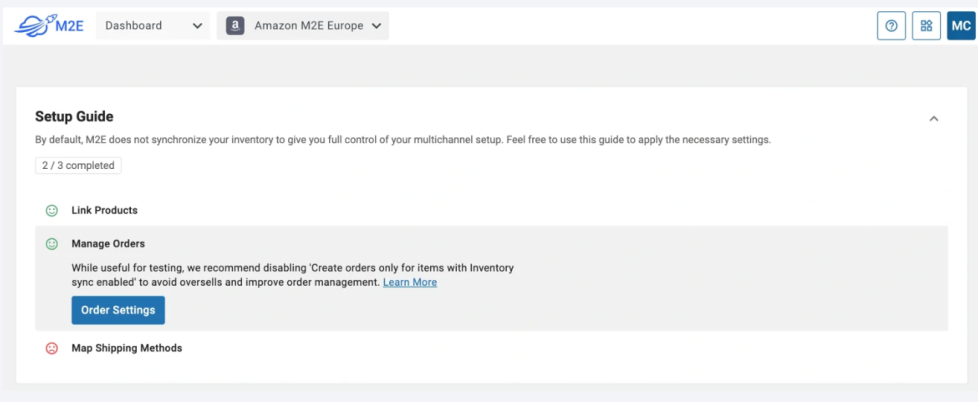 Once the connection is established, M2E displays a simple checklist to guide you through the remaining setup steps.