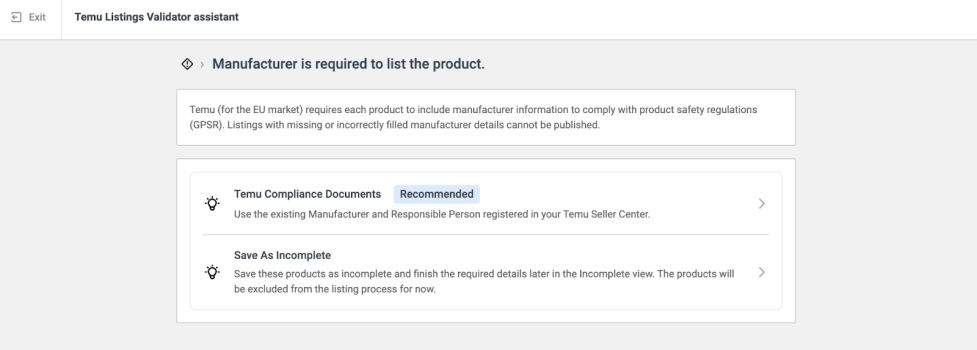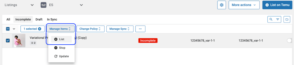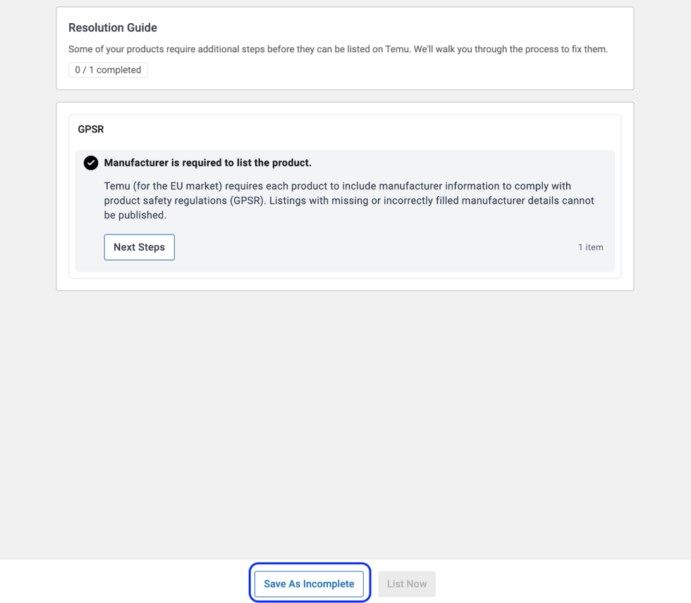 If you are not ready to finish, save the products as Incomplete. Later, open the Temu Listings page, filter by Incomplete, make your updates, and use Manage Items โ List to resubmit them for review.
