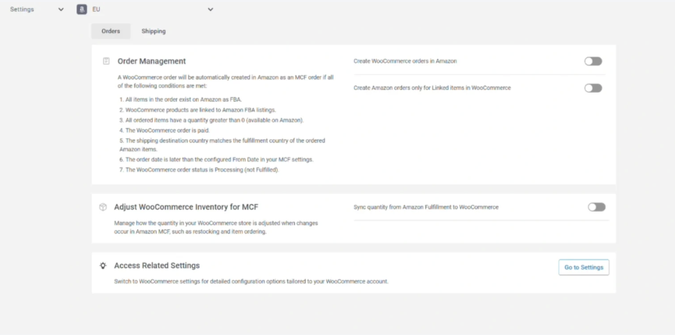- Order Management. Turn on Create WooCommerce orders in Amazon to send new paid Woo orders to MCF. You can limit this to items already linked to FBA. Orders are sent only to MCF if the product is in FBA and has enough stock.