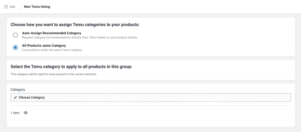 - Choose All Products same Categoryย to apply one Temu category to all items in the batch if they belong to the same type.