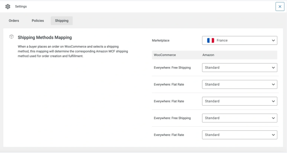 - For each Woo shipping method, pick the matching Amazon MCF option.