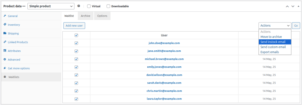 Once this email is sent, Waitlist for WooCommerce removes all users from the waiting list for this product. If the product is subsequently switched back to ‘Out-of-stock’, the waiting list will be empty.