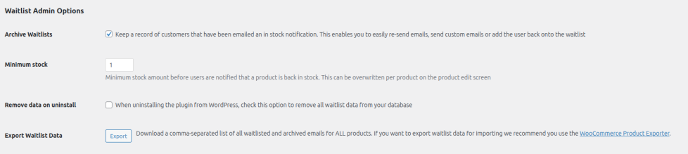 - Minimum Stock – The minimum stock amount required for waitlists to activate and send in stock notifications. This can also be set per product on the product edit screen.