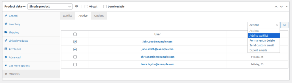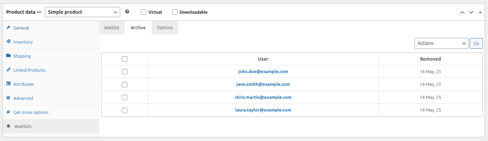 On the archive tab the shop manager has options to add customers back to the waiting list (these customers will remain in the archive until deleted), permanently delete customers from the archive or send the customers a custom email (if, for example, it is suspected a notification email has not reached them). If a customer removes themselves from the archive (via the “My Waitlists” tab on the “My Account” page), this tab will also reflect this: