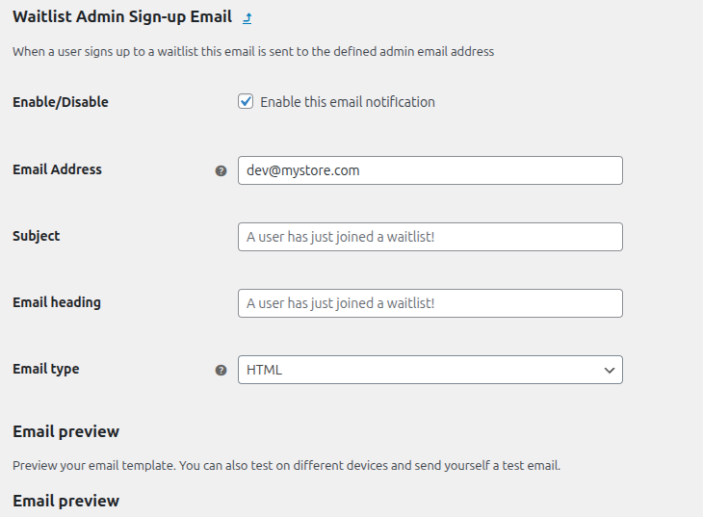 ↑ Back to topThe content of the email and the subject line are both editable via the WooCommerce email system. Waitlist for WooCommerce adds a new section to the ‘Emails’ tab of WooCommerce Settings where this can be managed. More information at: Configuring WooCommerce Settings > Emails.